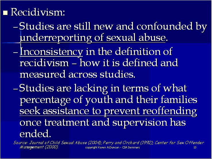 Caldwell, M. F. (2016). Quantifying the decline in juvenile sexual recidivism rates.Psychology, Public Policy, and Law, 22(4), 414–426.