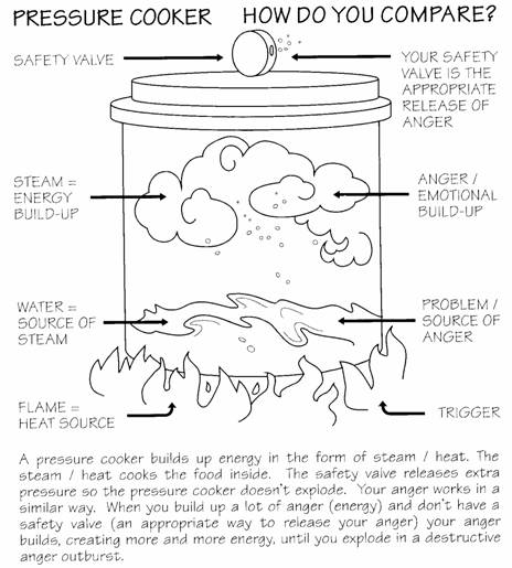 As you can see from these examples, anger can be helpful. Whether your anger is helpful or harmful depends on how you use or express it. People do not need to take their anger out on each other unnecessarily. Unfortunately, many people in our society have problems with their anger. When you ignore your angry feelings and let them build up, you become like a pressure cooker and suffer from the negative effects of anger (see Figure above). Some of the negative effects of anger include: 1. Anger stops you from thinking, feeling, and acting clearly. When you are angry you may "see red"—you do not think clearly before you act. You do not make good choices. When you are angry you are likely to do things that you later wish you hadn’t done. Anger creates "tunnel vision," which limits your ability to see other solutions. 2. You probably become angry more often than you have to. You may become angry whenever you are feeling embarrassed. When you are embarrassed, you may react by insulting or hurting others because your pride is hurt. lnstead of admitting you made a mistake and taking the çmbarrassment in stride, you may lash out at people physically and/or verbally. 3. Anger and aggression have a lot to do with each other. Even though it is okay to feel angry at appropriate times, excessive anger can build up. When you do riot take care of your anger, it can lead to aggression. Remember that anger is a feeling, like joy, happiness, jealousy, and so on. Aggression, however, is completely different. Aggression is taking action against a person, an animal, or an object. Aggression is either physical or verbal. It is meant to cause pain or hurt the object of your aggression. When you are angry for a long time, you are more likely to become aggressive. Your aggression hurts others as well as yourself. All too often aggression results in violence. 4. When you become angry, people think of you differently. When you hold on to your anger for long periods of time and over many situations, people relate to you as grouchy, possibly threatening, somebody who is not pleasant to be around. People will not trust you. They fear you may lash out at them either verbally or physically. Because you are angry, you feel bad and you may start to insult others as a result of your anger. When you feel bad or very angry, you may push or strike others physically: you commit an assault. The result can be that you do not feel good about yourself. Few people like to be around people who are angry most of the time. Angry people usually have few friends, mostly other people who have anger problems. Angry people feed into each other’s anger. Misery loves company, but the company makes you miserable. Few people want to be around someone who may be verbally and/or physically abusive over even minor disagreements. Anger is best dealt with at the time you feel it. If you feel angry about something you have choices. You can discuss it with the other person, or you can let the anger build up inside of you until it becomes aggression. Some people’s anger grows until they explode into aggressive acts. They lose control and they punch someone, call others names, lash out blindly, break things, rape, molest, scream and yell, kick pets, or knife or shoot another person. Some of these examples, though extreme, happen on a daily basis. In most cases, the victim of the aggression was simply in the wrong place at the wrong time. The victim of aggression does not provoke the angry act. The angry aggressive person may not have even been mad at the victim of the outburst—the angry attacker simply chose to let himself lose control. Eddie’s anger problem (next page) demonstrates this point. In some cases the victim and the attacker do not even know each other (for example in a riot or a mob scene). The person with the anger problem chooses to let himself lose all control. When anger builds and goes untreated, it can affect your life and the lives of others in a variety of ways. Uncontrolled anger never affects your life in a positive way. it eats away at you like a cancer. Personal