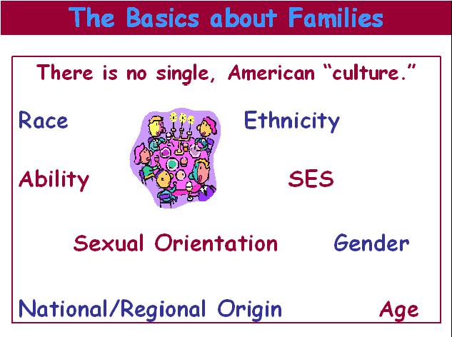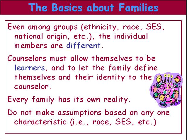 2 Question 2 | Test | Table of Contents There is no single American culture in the room. Race is all blended, ethnicity, ability, socio-economic standing, sexual orientation, gender, national or regional origin, age, these are all factors that play into the melting pot. We can’t just say Caucasians are all this way, African Americans are all this way, men are all this way, women are all that way because there is a lot of difference, a lot of blending together. So no family is going to be all Mom, Dad, who was Sally and Dick and Scott and Fluffy from all those years ago. Age, kind of like blurs now, as people enter and exit relationships more often and age ranges, you can find families where one child is 62 and one child is 12. A whole variety of what you see, so these are all kind of blending together. So when we think of family, we really need to expand our idea of what family looks like. Even among groups, the individual members are different and always remember that when you are working with clients, don’t assume that because Mitchell is 17, we can assume him to be like all other 17 year olds or all other teenage boys. Everyone in the family can be very different and counselors must allow themselves to be learners. You have to assume you are going to learn as much from the family coming to you as they will learn from you. It’s a chance for you to broaden your own idea of what family is. And let families define themselves for you, don’t assume you have to have extended family. Well maybe it’s just extended family of a family of choice versus family you love. Every family has its own reality. And that’s really important to remember that just because this is the way your family does it, doesn’t mean that’s the way every family’s going to do it. Whether its celebrations, religious beliefs. And don’t make assumptions based on one characteristic because we are very much likely to be wrong. Don’t just say just because they look a certain way or they check a certain box on the intake form, that they are going to be a certain way. Keep your mind open. When you work with families who are different, basic skills are the key to success, is one of the ways we talk about this so often in counselor training programs. Empathy, support, these things are really key to establishing the bond that’s going to help you work with that family. Building the relationship requires listening carefully and showing interest. Listen to the families talk as they tell you about their rituals and their beliefs, really listen to them. Step inside of their shoes, use your powers of empathy to understand what their life is like. Communication skills are really important. Having a wide variety of techniques. Different cultures respond differently to different techniques. Open questions, closed questions, paraphrasing, it’s really important to understand the who. Find out what works. Pay attention to non-verbals to see how people are responding to you. Read up on different ethnicities, different gender orientations, whatever it may be. Do as much reading as you need to get to feel comfortable working with someone who is different. Learn from the family then do your own work. Learn from the books, the literature, colleagues, supervisors. Below are the PowerPoints that accompany the instructor's lecture for this section.