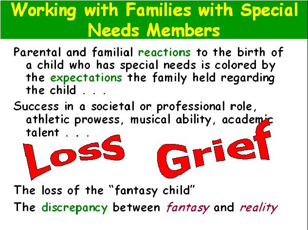 10 Question 10 | Test | Table of Contents The last basic group we’re talking about is working with families with special needs members and this incorporates developmental delays, physical illness, mental retardation, just a host of children who are different and what that’s like for families who have a special needs member in the family. Criminal and familial reactions to the birth of a child who has special needs is usually colored by the expectations the family had for that child. During the nine months of pregnancy, women, men, parents, all start thinking about who this child will be, what will this child will be like, maybe success in society, professional role, my little doctors, moms carrying my little doctor, my little baseball player, my little musical prodigy, my little brilliant scientist, whatever it may be that we all have this expectations and when the child is born and the diagnosis is made, there’s a really huge sense of loss and grief and their grieving for the child that won’t be, the fantasy child. It can be really hard for parents to sometimes accept the fact that their child won’t be those things they fantasized to be. And the discrepancy between fantasy and reality is really hard for some parents to accept. Sometimes with first-born children, it can be especially traumatic or if there are several other children already in the family who are happy, perfect children, having a child at school that has special needs can really throw people for a loop. And so loss and grief are the first two big kind of emotions that parents might have to cope with and grief is very hard work. Also, these can be reactivated throughout the life cycle, family life cycle, when your child is turning five and should be getting on the school bus for the first time and your child can’t go to school for some reason or the child is to ill to go. Turning sixteen, major milestone, the whole driving thing, graduation from high school, should be going to college. All these ‘my child should be doing this’ and he or she is not can reactivate that sense of loss throughout the life and so you should be aware that if a family comes to you and maybe the child is sixteen or seventeen years old and they’re just now seeking counseling for what they don’t know, they’re unhappy, they’re mad, a lot of anger, it may be anger that’s hiding with grief and a sense of loss that when their child should be becoming independent and moving away from home, and the child is not, they may realize that this might be who we are for the next fifty years or whatever it may be. That sense of loss is reactivated during milestone events. Below