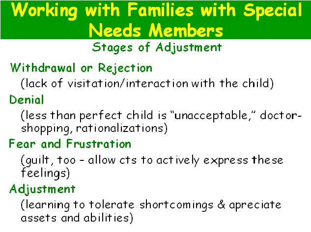 11 Question 11 | Test | Table of Contents Stages of adjustment they found are very much like the stages of accepting death and dying if you read Kubler-Ross’ work about death and dying. Withdrawal or rejection may be the first stage. If the child is a newborn in the neo-natal intensive care unit, if a family just can’t accept that, then they may not visit the child, they may be hesitant to hold the child, they may be fearful of getting emotionally attached to the child if they think the child may not live or if the child is going to be different. Denial is the next stage. The less, imperfect child is unacceptable and so they’ll do the doctor shopping just looking for a doctor to tell me something different. Tell me my child is not going to be like this. Tell me the first doctor was wrong. Rationalizations about it, well the child will be different in another week, or two weeks, or a month, or a year. Fear and frustration, and also guilt. There’s oftentimes a lot of guilt in the parents who give birth to a child who isn’t perfect. Clients need to be able to express these feelings and also there’s a sense of blame sometimes, we all feel the need to blame someone when something goes wrong in our family and so sometimes the parents may blame each other, there may be some of that going on that’s not verbally addressed but just kind of under the surface but it helps sometimes to get these feelings out to be spoken about, when it’s just tacet, you can’t work with it. So as a counselor, you have to get people down there to those feelings so they can put them out there and can be free of them. So if you feel like there is something going on beneath the surface, don’t be too afraid to go down there and to look for what’s going on, look for the issue that’s really getting in the way of the family adjusting. And eventually, hopefully, the family can move towards adjustment where you learn to tolerate the shortcomings of the child but then celebrate whatever assets and abilities the child has. Where you begin to see the positive parts of the child’s life and what they bring to your family, rather than dwelling on those negative extra, the hard work, the guilt, the blaming, all of the negative feelings that go along with the child. Some of the areas, this is just really back to basics, when you’re working with a family, seven areas that they suggest that you asses: sleep disturbance, how many people have been sleep deprived for any amount of time in your life and how do you function when you’re sleep deprived, so if you’re all running on two or three hours of sleep because a child needs around the clock care, even if it’s a healthy, newborn baby, sleep disturbances happen, you can’t function well and you’re not going to be able to function well as a family if no one is getting a good night's sleep. The physical burdens involved in caring for a child who may be disabled physically, there may be more lifting, carrying, hard work, the physical bathing, just taking care of someone. I worked with a family with two fourteen year old twin boys, one boy was on the school football team and one boy had cerebral palsy and could not move anything but his hands a little bit and it was very difficult for the family to see one healthy boy born one minute then this other child born a few minutes later who wasn’t as able but there was physical labor involved, there were three kids and a single parent and they all had to help care for the child. They had to go round the clock schedule and there was a lot of resentment and anger among the healthy children that this other child got so much attention. A lot of it where they were tired, they were worn out, this boy weighed 180 pounds, it was a lot of work getting him from the wheelchair to the car to his bath. Be aware the physical burdens. Complicated diet sometimes can make sometimes just daily housekeeping a big chore. Extra housekeeping again, financial stresses, house and auto adaptations, and unpredictability of disorder and illness, not knowing how your child will be tomorrow can be very really nervous, make it hard for parents. Whatever you do, assess all these areas and then gear your interventions to each family's unique needs. Don’t assume well Holly this is a type of disorder your child has, here’s a step-by-step guide of what you’re going to do to cope. I need to understand you on many different levels, many different aspects of your life to give you the kind of guide that’s going to help you and you’ll co-create the guide. I can’t tell you what to do, we’ll talk about what’s gonna work for you and your family. Be willing to talk about these things. Steps in helping the family cope. Evaluate the alternatives with them. Have them commit to a plan. Have them agree these are the steps I’m gonna follow to help get through this crisis. And lastly, we would like the client to summarize the progress made, to evaluate your goal attainment, and then you might cycle back through if another problem creeps up. But by having the client talk about their own progress and evaluate what they’re doing, that’s having them take an active role in seeking help. It’s helping them learn that they can take care of their family and themselves by taking action. Help them accept their child and focus on improving interaction. You go through helping, accept, there are things you can do. Accept your child, there are things we can do to help you make the interactions and the prognosis much better. Below