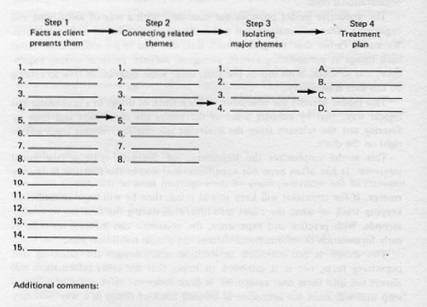 Section 14 Question 14 | Test | Table of Contents During a crisis interview a client will frequently give the counselor a great deal of information about himself and his crisis. Oftentimes this information will come pouring out in such rapid fashion that if the counselor is not prepared, he can get confused and overwhelmed, missing valuable points. Since all of this information is so important to the counselor in forming a comprehensive picture of his client’s crisis, it is necessary to have some kind of plan regarding the organization of this information. The deductive model is an example of such an organizational plan. The deductive model provides the counselor with a way of identifying and organizing client information that will facilitate the process of crisis resolution. We stated earlier that the goal of each interview was to get information about such things as precipitating events, strengths, deficits, previous coping experience, and so forth. With this as the goal, then, some diagram of how to catalog all this data is necessary. This model permits the counselor to keep track of things in a systematic and logical way, first by keeping a list of the things the client says and then by filtering out the relevant from the irrelevant information, moving from left to right on the chart. This model emphasizes the importance of the early part of the initial interview. It has often been our experience that within the first ten to twenty minutes of the interview, many of the important facts of the client’s crisis will emerge. If the counselor will keep this in mind, then he will begin immediately keeping track of what the client tells him, even during the first ten to twenty seconds. With practice and experience, the counselor can increase his skills at early formulation of informational themes and a crisis resolution plan. This model is not intended to exclude other designs for gathering and organizing facts, nor is it intended to imply that the crisis information will always fall into these neat categories. It does, however, offer a plan or a mental map that will assist the counselor in keeping track of things in a way that may reduce confusion. With practice and rehearsal, along with some other teaching aids like a tape recorder or an observer, this technique can be mastered to the benefit of both client and counselor. Many of the major crisis themes have been isolated in actual practice by a variety of counselors in training, most of whom report that after a few concentrated attempts they are able to employ the model successfully. These counselors have found the method helpful during the initial phase of the interview.