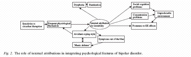 Section 17 Question 17 | Test | Table of Contents Need for an integrative model One influential model for the development of treatment approaches has been the instability hypothesis which suggested that vulnerability to disruption of circadian rhythms is fundamental to BD. Circadian rhythms are patterns of physiological activity that cycle over an approximately 24-h periods including sleep, body temperature, cortisol and melatonin secretion. Circadian rhythms are entrained by both physical (e.g. light/dark) and social/behavioral zeitgebers. Numerous studies have reported disrupted circadian rhythms in acutely ill BD patients. More recently, studies have found sleep and activity disruption in remitted BD patients suggesting that it is a trait factor. Monk et al. social rhythm metric (SRM) assesses the extent to which individuals have a stable activity pattern, as a proxy measure of circadian functioning. Psychological treatment can have a significant effect on SRM, whilst instability on the SRM is associated with elevated risk of mood episodes in individuals with cyclothymia or BD II. This proposed vulnerability and its interaction with psychosocial events, stimulated the development of Interpersonal and Social Rhythm Therapy (IPSRT) which combines standard IPT with development of stable patterns of regular activity. IPSRT is associated with stabilization of social rhythms and with longer euthymic periods than clinical management; but to date there is no evidence of a differential impact on relapse rates or mood symptoms. A multilevel model approach to integration Jones proposed a model of BD integrating circadian instability with psychological functioning which builds on the work of Healy and Williams. The model uses a multilevel approach to cognition and emotion to explore how circadian instability might lead to the observed clinical symptoms of BD. Single-level models of emotions, such as those of Beck et al., have limitations with respect to BD. The illness course of many BD patients is characterized by extended periods in mixed emotional states, where for instance elevated mood and irritability/anger co-occur. Any model therefore needs to accommodate the generation of parallel and even potentially conflicting emotional states. Jones_ model is therefore based on the Schematic Propositional Analogical and Associative Representation Systems (SPAARS) approach of Power and Dalgleish. In SPAARS external events are first processed analogically; a rapid and modality specific level. Further processing at a propositional level employs abstract language-based models [similar to automatic thoughts within Beck’s model of depression]. Direct emotional outputs occur via schematic and associative levels. Schematic processes integrate information from all other processing systems into knowledge at a level _beyond verbally expressible propositional concepts. The contrast here being between _prose_ description at a propositional level and _poetic_ description at the schematic level. Schemas are dynamic and flexible with respect to changing inputs from other levels and guide behavior. The associative level permits events, either through repetition or through salience, to trigger emotional output. It also allows for different emotional outputs at different levels of the system (such as the phobic patient who _knows_ that the feared object is harmless, but _feels_ they must continue to avoid it). This model suggests circadian rhythm disruption is an important factor in triggering episodes. However, many other groups experience circadian disruption without experiencing bipolar episodes. What makes BD patients especially vulnerable? Jones draws on evidence from the psychological literature indicating that individuals with BD make internal attributions for both positive and negative events which suggests that when experiencing the effects of circadian disruption they will also make internal attributions. Additionally, Robbins and Kirmayer found individuals with a chronic psychiatric history (not restricted to panic disorder patients) have a greater tendency to make internal psychological attributions for common somatic experiences, whilst individuals at risk of BD also tend to make more positive internal attributions for physiological changes associated with hypomania. These factors suggest, not only that individuals are more prone to circadian instability, but also that the interpretations they make may lead to behavior which exacerbates these fluctuations. Figure 2 illustrates how this development of the instability hypothesis might integrate a range of psychological findings with respect to BD, referred to previously in this paper. In particular it is proposed that the avoidant or ruminative coping styles in response to initial mood changes can place the individual at risk of developing prodromal mood states. Whilst distraction has been reported to have benefits in unipolar depression, high-risk studies have reported associations between hypomania and both distraction and engagement in dangerous activities. It has been shown that poor prodromal coping styles for depression (withdrawal and rumination) and mania (sensation seeking/risk taking, increased goal directed activity) are associated with poorer social functioning and higher risk of relapse. Figure 2 indicates that avoidant coping styles (sensation seeking or risk taking) might relate to the _manic defense_ hypothesis. This suggests mania is triggered by efforts to avoid low mood. Although not conclusive a number of studies indicate BD and unipolar participants exhibit similar levels of pessimistic attributional styles on implicit tests, whereas BD participants show an opposite pattern on explicit attributional measures. Furthermore, both behavioral high-risk and depressed and manic BD participants exhibit attentional biases to depression but not mania-related words in an emotional Stroop paradigm.