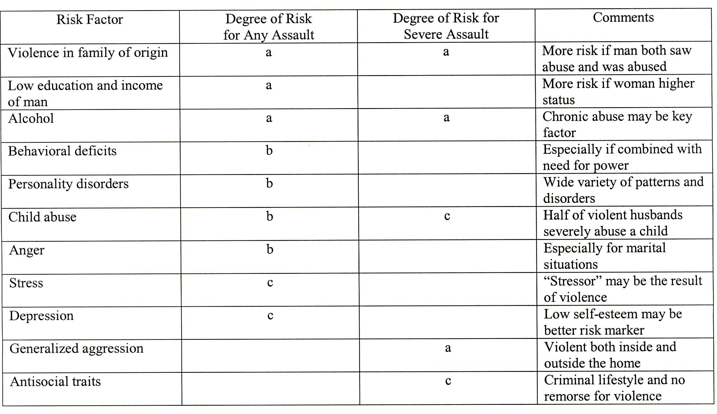 A judge wonders whether she should sentence an assaultive husband to a treatment program. Several years ago the man was imprisoned for selling drugs, and he made a mockery of the prison's treatment programs. An intake counselor at a domestic abuse program, asks his supervisor whether a man he is assessing should be treated immediately or wait a month for group treatment. The man has been violent outside the home, including fights with friends and police officers when he was drunk. His wife called to say that she does not feel safe staying at her mother's house. He once came through a window there and knocked her mother down in his attempt to find her. These are just some of the types of situations practitioners routinely face that call for the prediction of domestic violence. Although the science of predicting wife assault is quite inexact, practitioners frequently make informal risk assessments of future violence (Gottfredson & Gottfredson, 1988). In some situations they are legally mandated to assess imminent danger and to attempt to avert a tragedy. As domestic abuse programs work more closely with criminal justice agencies, their staff increasingly will be asked to make formal predictions. Thus, although the "state of science" in this area is imprecise, practitioners need the best information available. The purpose of this chapter is to provide the latest scientific information on risk factors for wife assault and the clinical assessment of these factors. Special attention is given to predicting serious assault because of its severe consequences, including the possibility of homicide. Other types of prediction also are covered: What factors are related to recidivism after abuser treatment? When child custody is decided, is the abuser or his partner at more risk for abusing the children? What are the odds that a man who batters will be violent in a new relationship? Prediction in this area has many important applications-in sentencing, probation work, and treatment. Examples of these applications are given. When the terms wife and marital are used, unless otherwise noted they refer to cohabiting relationships as well. Major studies of risk factors combined cohabiting and married cases. Risk factor research on dating violence is less well developed and has been reviewed elsewhere (Sugarman & Hotaling, 1991). Review of