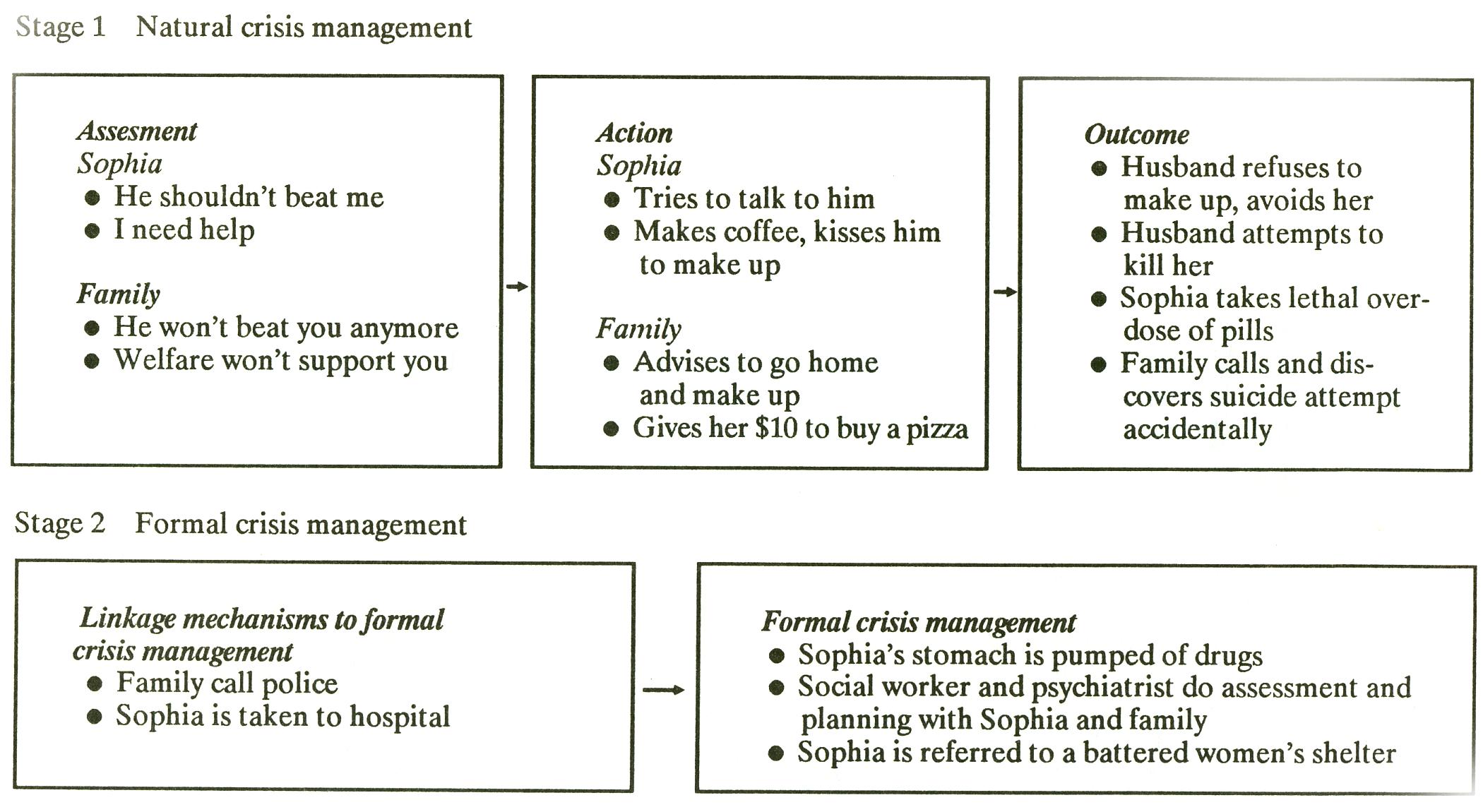 Another woman said that her usual way of coping with the trauma of battering was by overeating, a device she also used before she was ever battered. The terms 'illness', 'unhealthy', or 'destructive' can certainly be used to denote addictions and assaults on oneself and others in response to the stress of being battered. Regardless of how such negative coping devices are labeled, however, the women's accounts in this chapter support the earlier suggestion that stress, crisis, and illness (physical, emotional, mental) are interactionally, not causally related (see Figure 4.1, p. 70). Figure 4.1 suggests that stress not only precedes but also follows a battering episode, and that emotional crisis may or may not be part of the total episode. These findings also support the work of Hilberman (1980) in which mental and emotional disturbances of battered women were found to follow rather than precede battering. Analysis thus far reveals not so much a failure of coping by individuals as it does the limitations and misdirection of personal coping responses (natural crisis management) to certain traumatic life events. That is, suicide, assault, addictions, and emotional disturbance are forms of coping, though most people would regard them as unhealthy or ineffective (Caplan and Grunebaum 1967; Hoff 1989: 60-2). Put another way, 'natural crisis management' needs to be supplemented by 'formal crisis management', assistance from sources beyond the individual and immediate family. The need for both personal coping strategies and social support has profound implications for the successful resolution of crises around battering. In Sophia's case the initial support she received from her family was misdirected, e.g. 'You go back ... he won't do it anymore ... Welfare won't support you .Here's $10, go buy a pizza and forget everything.' Only after a near-fatal suicide attempt were institutional networks mobilized, and these only for emergency rescue purposes. Prior to this destructive crisis outcome, however, crisis management did not go beyond the 'natural' level. The suicidal outcome of the crisis suggests that 'formal crisis management' was needed as well. The distinctions and relationship between natural and formal crisis management as applied to battering are illustrated in the Figure below.