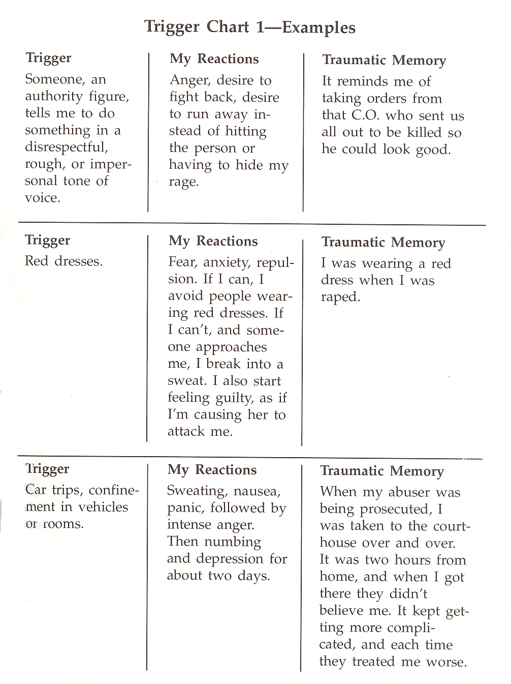 At this point you will make a trigger chart, which can be invaluable to you first in identifying, and later in anticipating, situations in which you might react as if the trauma were recurring.
